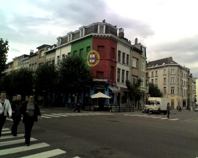 Café "O Espigueiro" na praça portuguesa de Antuérpia. Existe algo de especial nesta bandeira pintada...O que será?